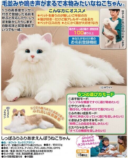 本物の白猫の鳴き声や、しっぽの動きで感情表現をします。まるで本物の猫と一緒にいるかのような体験が楽しめます。