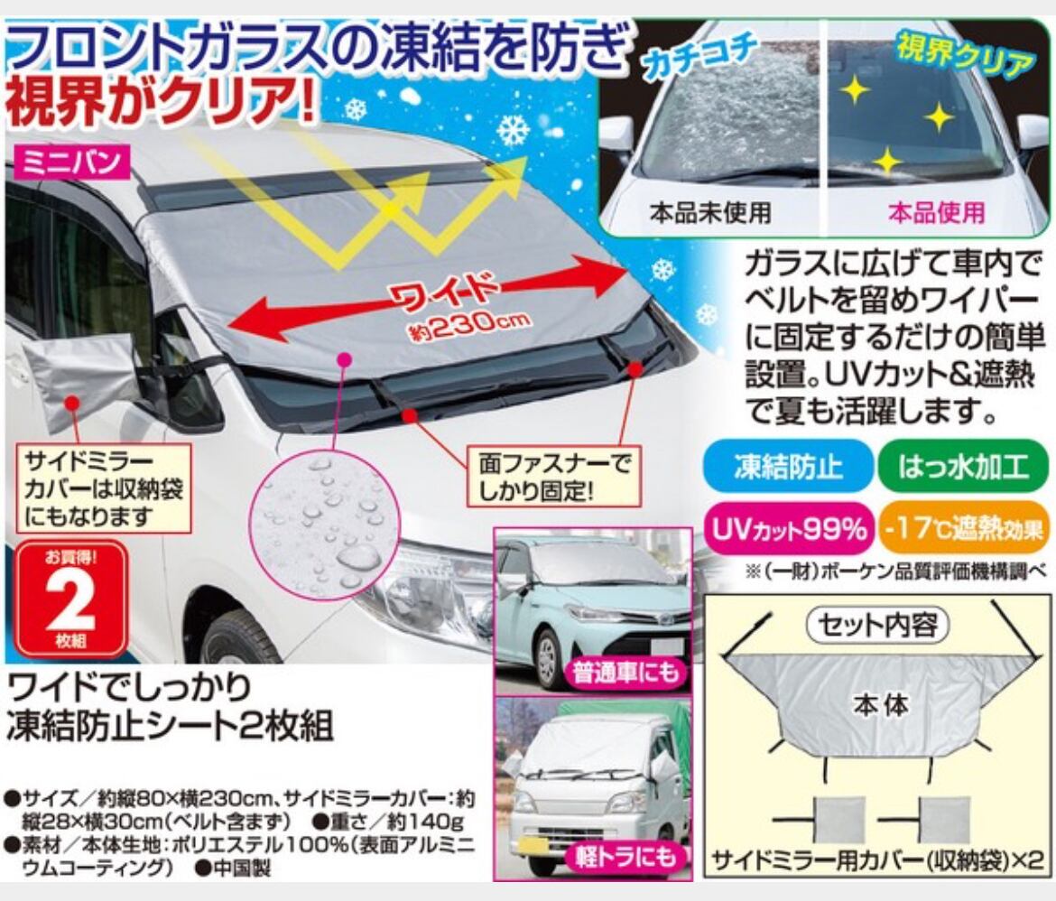 厳しい冬を乗り越えるための必需品、ワイドでしっかり凍結防止シート2枚組。大切な愛車をしっかり守るために、ぜひお試しください♪
